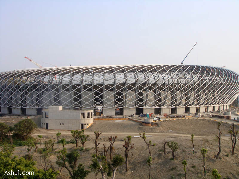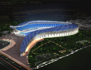 Đó là một công trình bằng thép mà mái là những tấm lợp tế bào năng lượng mặt trời, kiến trúc uốn lượn như một con rồng khổng lồ nhưng rất thân thiện chào đón các vận động viên và khán giả. Tổng cộng có 8.844 tấm lợp năng lượng mặt trời đủ sức cung cấp điện năng thắp sáng 3.300 bóng đèn cùng hai màn hình cực lớn. Lượng điện năng sản sinh hằng năm khoảng 1,14 triệu kWh, nếu dùng nhiên liệu như truyền thống thì sẽ có đến 660 tấn carbon dioxide phát thải vào bầu khí quyển.