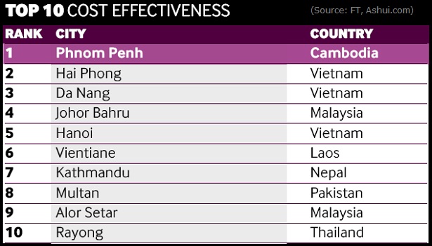 Hai thành phố của Việt Nam là Hải Phòng và Đà Nẵng, cùng với Phnom Penh của Campuchia đã lọt vào nhóm 10 thành phố châu Á dẫn đầu về tiêu chí chi phí hiệu quả nhất (cost effectiveness).