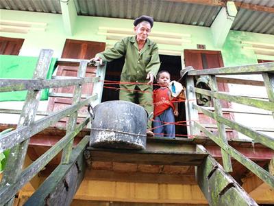 Ông Hối Lớn năm nay 87 tuổi, răng rụng tóc bạc, tháng trước rơi từ trên nhà xuống đất, giờ vẫn còn đau ở vai. Ông phải nhờ mấy trai bản trổ cho một chiếc cầu thang khác để đi. “Phải rào cái cầu thang cũ lại cán bộ ạ. Thằng cháu mình hay nghịch ngợm, nó mà ngã thì toi”.