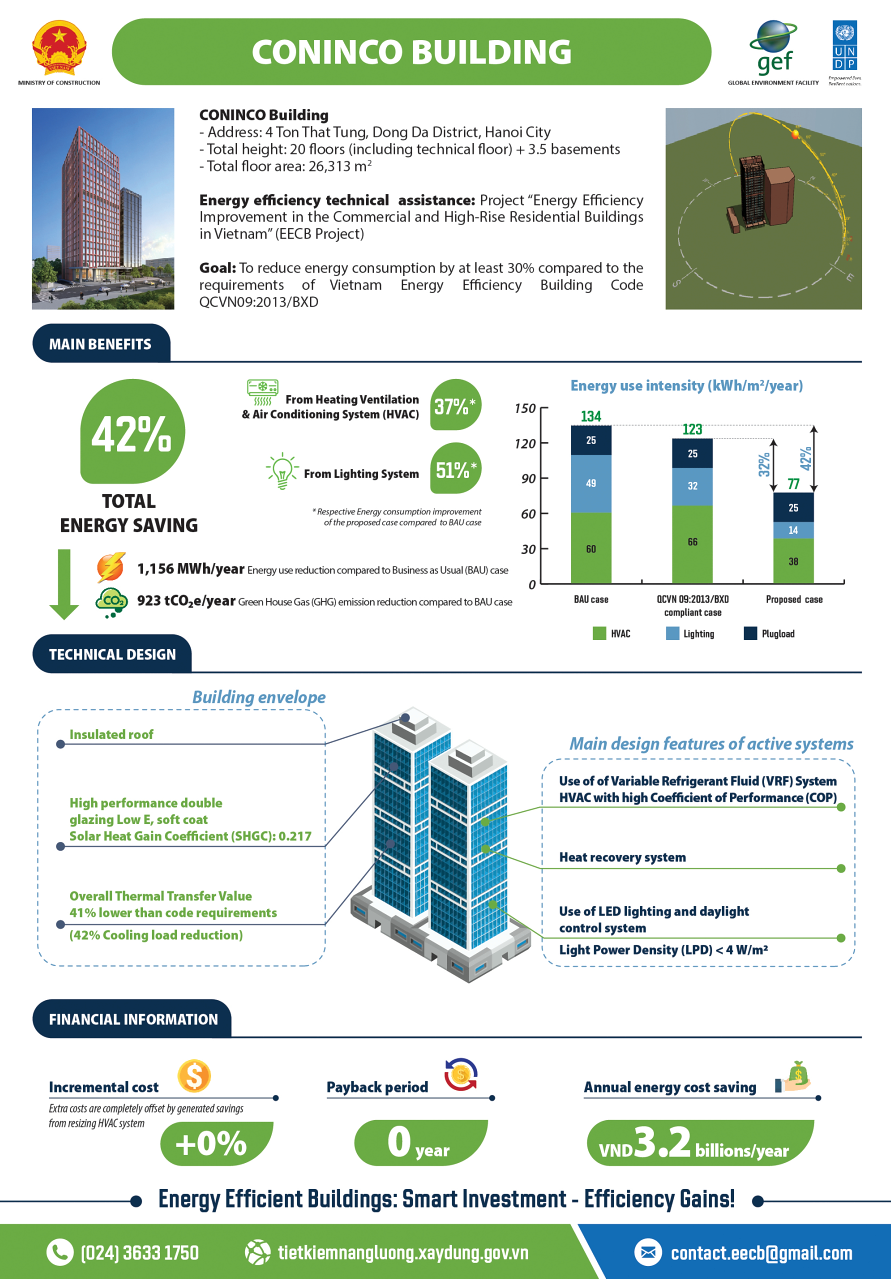 | Tòa nhà Coninco | UNDP/GEF VEECB | Lớp vỏ chất lượng nhiệt rất cao và hệ thống HVAC hiệu suất cao | 32% (so với QCVN 09:2017) | Không tăng | |