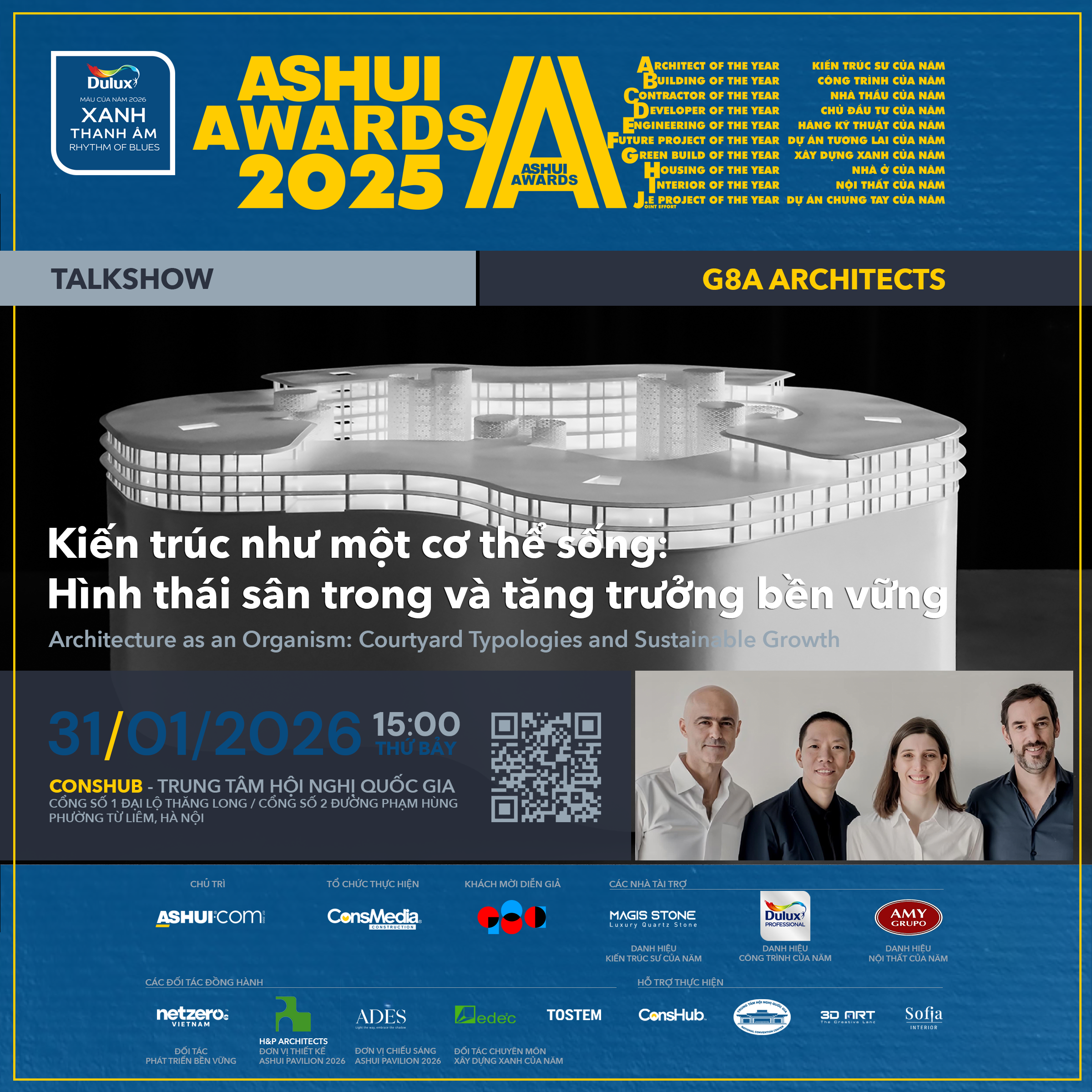 15:00 – Talkshow: “Kiến trúc như một cơ thể sống: Hình thái sân trong và tăng trưởng bền vững” / trình bày: G8A Architects (“Kiến trúc sư của Năm 2025”)
