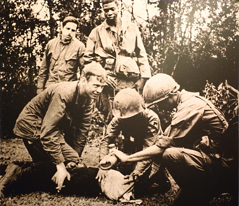 Còn đây là hình ảnh được coi là “sốc” nhất trong các hình ảnh trưng bày: Lính Mỹ thuộc Sư đoàn bộ binh số 25 đang xách mảnh xác một chiến sỹ giải phóng vừa bị trúng đạn súng phóng lựu – Tây Ninh 1967. Rất nhiều người đã đứng lặng trước hình ảnh này…