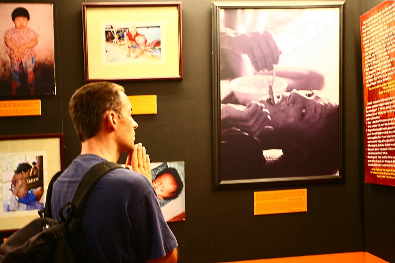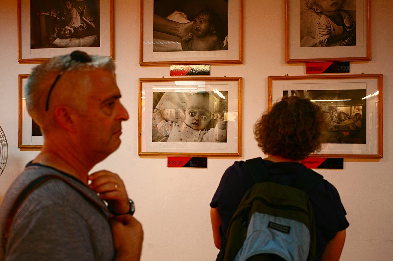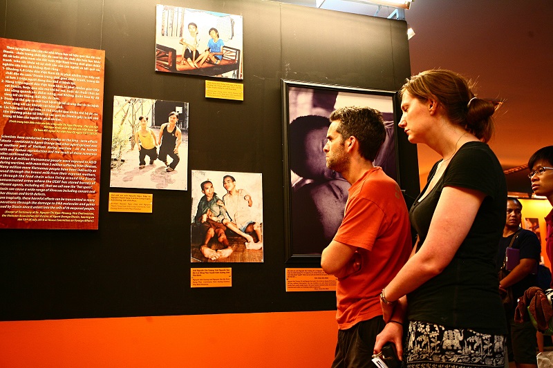Trong không gian trưng bày “Hậu quả chất độc da cam trong chiến tranh xâm lược của Mỹ ở Việt Nam”, màu sơn da cam trên tường gây ấn tượng đến nhức nhối và ám ảnh. Những hình ảnh thương tâm của những nạn nhân chất độc da cam, và cả những bào thai nhiễm chất độc da cam (hiện vật thật) khiến người xem rùng mình… Trong không gian tĩnh lặng ấy, có thể nghe rõ tiếng thở dài, tiếng lầm rầm cầu nguyện, tiếng nấc, tiếng khóc sụt sịt. Những bàn tay đưa lên làm dấu Thánh, những bàn tay chắp lại trước ngực… Tất cả làm nên một không khí rất đặc biệt ở Bảo tàng Chứng tích chiến tranh, thật khó tả bằng lời.
