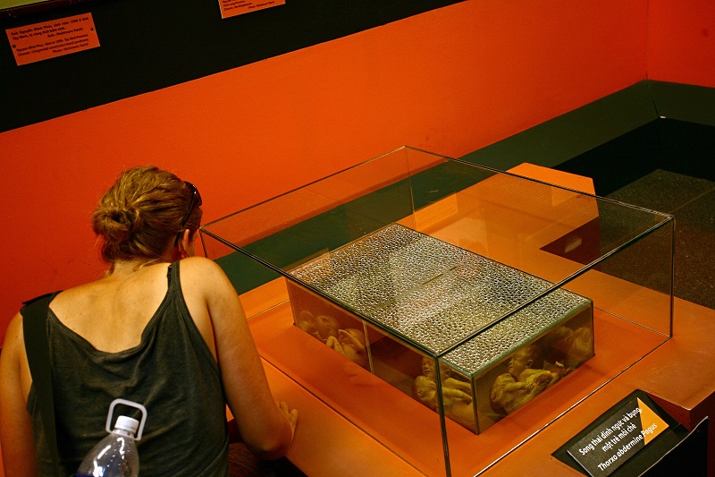 Một nữ du khách đang nhìn tiêu bản bào thai song sinh dính ngực và bụng, do di chứng chất độc màu da cam