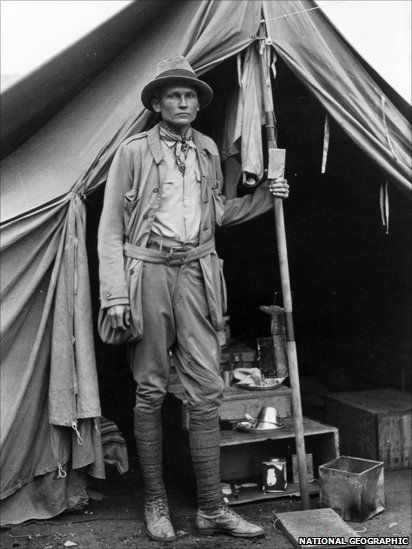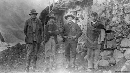 Bingham (trái) và nhóm nghiên cứu của ông trong một chuyến thám hiểm tới Machu Picchu năm 1912, một năm sau khi ông phát hiện những tàn tích thành phố của người Inca.