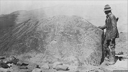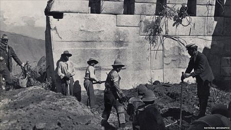 Thường được gọi là “Thành phố đã mất của người Inca”, Machu Picchu được một số học giả tin rằng là nơi khai sinh của đế chế Inca. Bức ảnh trên chụp ông Bingham đang xem xét những hình được chạm trổ trên một tảng đá lớn.