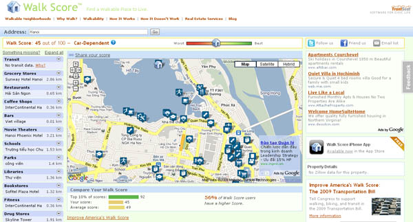 Trong những bài viết trước chúng ta đã đề cập đến những cải tiến trong các lĩnh vực công nghiệp xanh. Lần này, chúng ta lại lấy một ví dụ khác trong lĩnh vực công nghệ thông tin, đây là trường hợp của Walk Score. Walk Score – một phần mềm tương tác với Google Map để xác định bất cứ vị trí nào trên trái đất cùng với các khả năng tiếp cận vị trí này bằng đi bộ từ các tiện ích, dịch vụ khác trong đô thị. Thoạt nhìn, ứng dụng này mang khía cạnh thông tin đơn thuần. Tuy nhiên, các văn phòng môi giới bất động sản đang sử dụng công cụ này để quảng bá về các sản phẩm bất động sản của mình để cho thuê hoặc bán. Và điều này sẽ đem đến cho chúng ta những gì khi mà nhiều khả năng một khi ứng dụng này được phổ biến thì sẽ tác động lên diện mạo mà đô thị chúng ta đang sống. Kết quả có thể hình dung là việc hình thành nhiều khu đô thị mật độ cư dân cao với các không gian dành cho người đi bộ và cho phép tiếp cận nhiều loại hình dịch vụ và tiện ích của đô thị mà không cần sử dụng đến các phương tiện giao thông gây ô nhiễm.