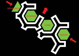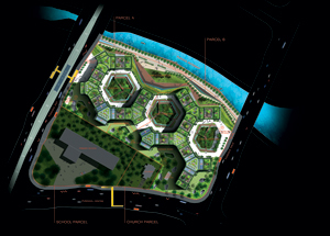 Chúng tôi đã bắt đầu với một hệ thống tổ hợp hình lục giác với các góc 120° và một nguyên tắc về hệ thống những khoảng sân terrace. Với sự kết hợp này, chúng tôi đã tạo ra được hình dáng hoàn thiện trọn vẹn của môđun, phù hợp với hoàn cảnh và điều kiện tự nhiên của mảnh đất. Công trình cao tám tầng ở mặt đối diện với dòng kênh và dần cao lên 18 tầng ở phía đối diện với trục đường giao thông chính khu vực. Những khoảng sân được mở rộng từ phía dòng kênh, trong đó hai sân mở để tạo ra lối vào cho tổ hợp và hai sân mở về phía kênh tạo ra những điểm nhìn thơ mộng và mối liên hệ tự nhiên với dòng kênh.