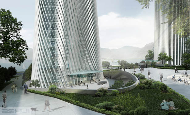 Dự án với 5 tòa tháp được bố trí theo một dãy cao thấp nhằm đảm bảo tầm nhìn không hạn chế hướng về phía dòng sông. Chiều cao của các công trình này thể hiện sự tương tác với các công trình xung quanh về phía tây nam và vươn cao trên một dải sóng hướng ra sông, nơi xác định ranh giới giữa thành phố và bờ sông Âu Giang. Cảnh quan nhấp nhô mang lại các không gian mở thoáng đãng với các hình dáng đa dạng – từ những khuôn viên riêng bên trong cho đến các đường rộng rãi dành cho khách đi bộ đến các công viên đô thị. Các lớp của không gian mang lại sự kết nối từ tất cả mọi phía và khuyến khích sự tương tác, giao tiếp giữa con người và các không gian.
