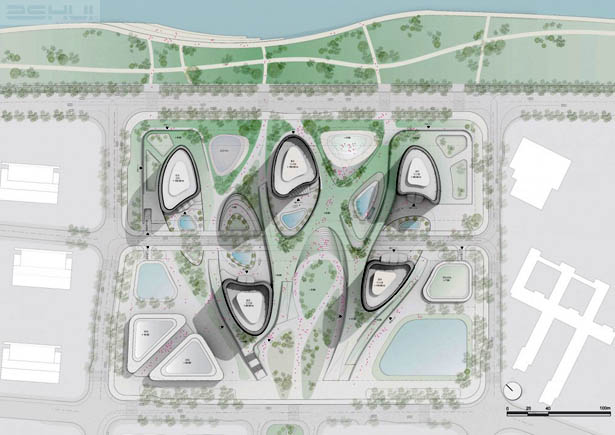 Bờ biển thành phố Ôn Châu bị chia cắt bởi mạng lưới chằng chịt của các con sông nhỏ và lớn. Phương án thiết kế sử dụng hình ảnh vùng châu thổ dòng sông và chuyển hóa nó trở thành một cảnh quan công viên tự nhiên mở rộng ra về phía biển. Hành lang xanh thoát ra khỏi thành phố trên toàn bộ khu đất, với các nhánh chia ra và hình thành nên một kết nối gợn sóng nhấp nhô giữa thành phố và khu vực tiếp giáp sông. Tại mặt bằng tầng trệt, cảnh quan kiến trúc hòa quyện với dòng chảy của những công trình xây dựng và đồng thời bám theo sự dịch chuyển của con người.