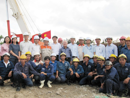 - Ảnh bên: Chủ tịch UBND TPHCM Lê Hoàng Quân chụp ảnh cùng với các kỹ sư, công nhân công ty Thoát nước đô thị thành phố tại buổi thông tuyến cống. (Ảnh: Q.H)