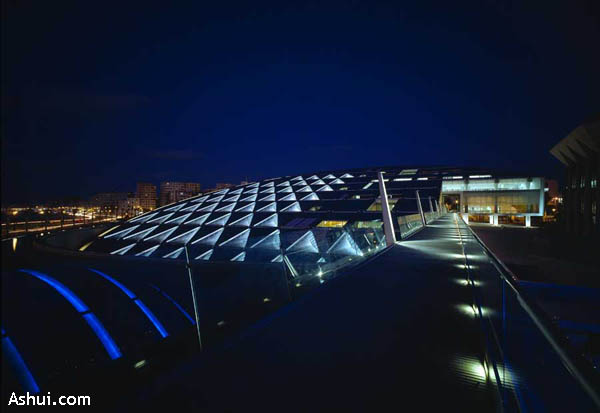 Với đường kính 160m, mái vòm được chia thành những ô vuông với những khối tam giác lõm lắp kính lấy ánh sáng