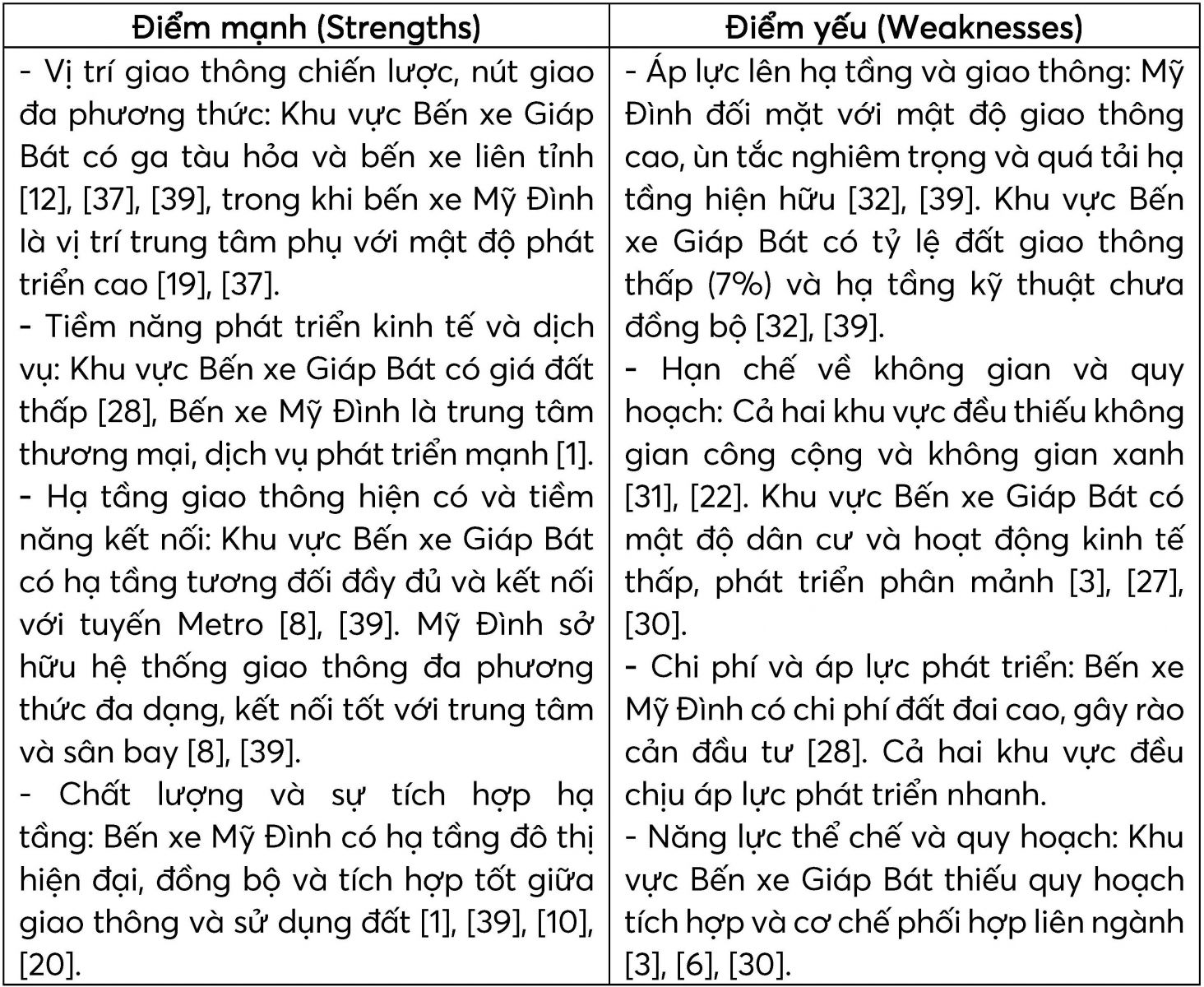 Bảng 1. Ma trận SWOT tổng hợp tiềm năng phát triển TOD tại khu vực Bến xe Giáp Bát và Bến xe Mỹ Đình: