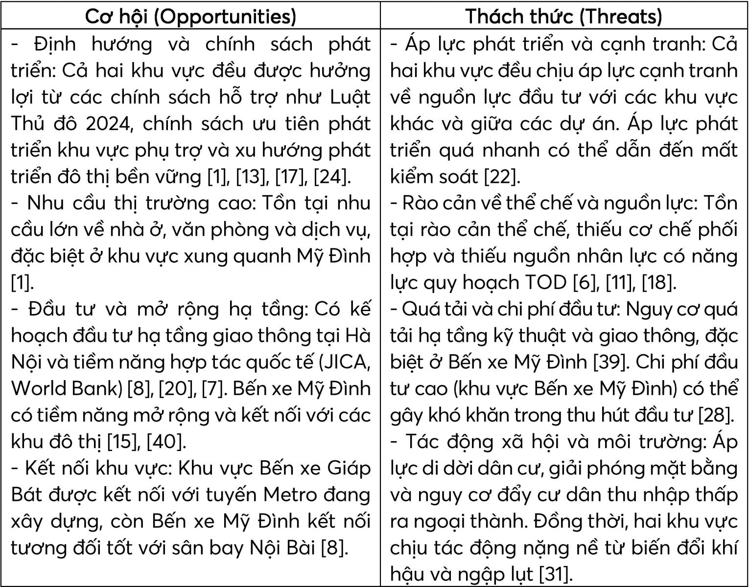 Kết quả phân tích SWOT cho thấy khu vực Bến xe Giáp Bát và Bến xe Mỹ Đình đều sở hữu tiềm năng phát triển TOD đáng kể nhờ vị trí chiến lược, kết nối đa phương thức và cơ sở hạ tầng hiện hữu, đồng thời tận dụng được chính sách hỗ trợ đô thị bền vững và cơ hội đầu tư từ nguồn lực quốc tế.