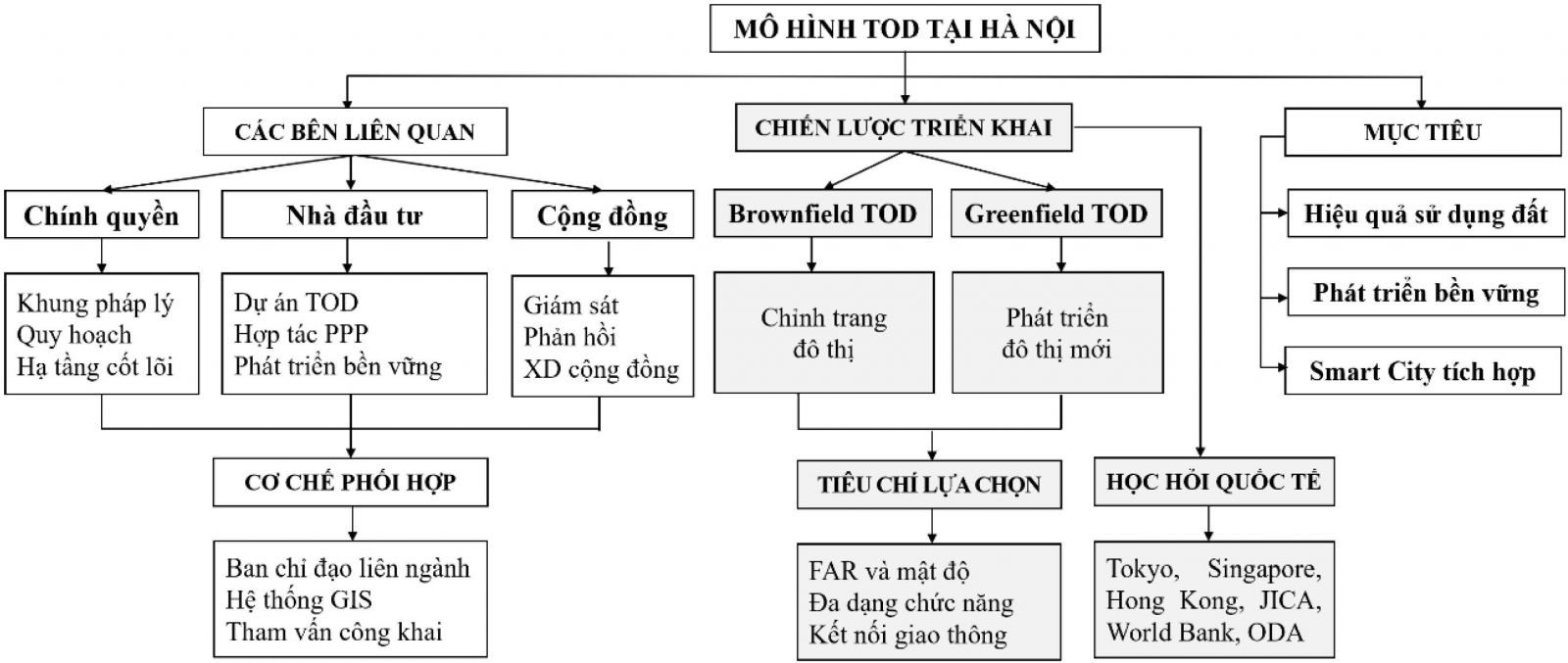 Chiến lược triển khai TOD cần kết hợp chỉnh trang đô thị hiện hữu (Brownfield TOD) và phát triển mới (Greenfield TOD), áp dụng các tiêu chí định lượng về FAR, mật độ dân cư, đa dạng chức năng và kết nối giao thông để lựa chọn khu vực [2], [10], [27]. Việc kết hợp học hỏi kinh nghiệm quốc tế từ Tokyo, Singapore và Hong Kong, cùng hỗ trợ kỹ thuật và tài chính từ JICA, World Bank và các nguồn ODA, sẽ góp phần tăng tính khả thi và bền vững cho TOD tại Hà Nội [7], [8], [20].