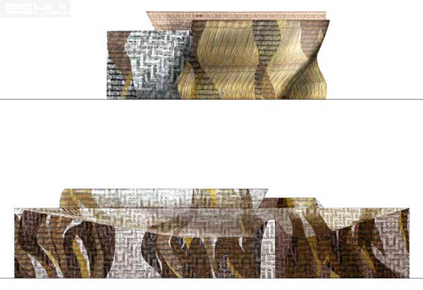 Những tấm panel được sắp xếp theo những màu sắc thay đổi từ nâu đỏ đến trắng, tạo nên những hoa văn lạ trên lớp da của công trình. Ba khối nhà liên kết như những chiếc giỏ đặt kề nhau, có chiếc để trống trên phần miệng, có cái lại được che lại, tạo nên những hiệu ứng ánh sáng thu hút khi mặt trời chiếu vào bên trong nội thất qua phần khung thép và màn lọc bằng những panel liễu gai. Các nhà thiết kế cũng chú trọng đến việc thông gió để tạo sự thoải mái cho khách tham quan bên trong.