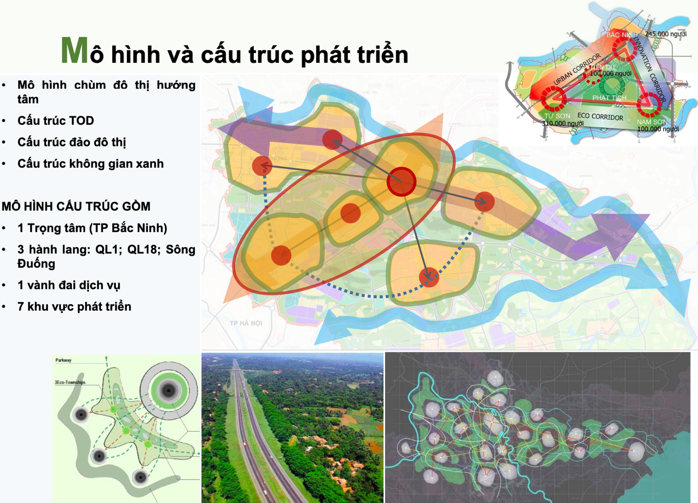 Mô hình này nhấn mạnh việc tạo ra 7 trọng tâm phát triển đô thị, lấy định hướng phát triển hệ thống GTCC làm cơ sở quy hoạch phát triển đô thị, lấy đầu mối giao thông làm điểm tập trung dân cư để từ đó hình thành tiếp hệ thống giao thông phân tán (TOD), được giới hạn bởi các “nêm xanh” (là các tuyến sông kênh, mặt nước sinh thái, công viên, làng xóm, bảo tồn di tích văn hóa lịch sử, cảnh quan sinh thái đặc trưng) và 03 hành lang phát triển gồm: Hành lang đô thị dịch vụ dọc Quốc lộ 1A (thành phố Từ Sơn – huyện Tiên Du – thành phố Bắc Ninh); hành lang đô thị công nghiệp dọc Quốc lộ 18 (huyện Yên Phong – thành phố Bắc Ninh – thị xã Quế Võ); hành lang sinh thái dọc sông Đuống, sông Cầu.