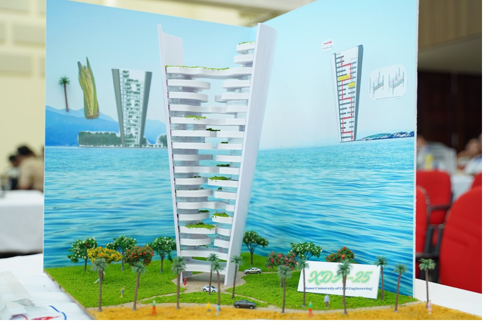 Tại cuộc thi, thí sinh thể hiện khả năng nói tiếng Anh lưu loát và kiến thức chuyên ngành vững vàng. Đồng thời, các sinh viên cũng đưa ra nhiều ý tưởng độc đáo, kết hợp giữa AI và BIM nhằm đạt hiệu quả tối ưu trong thiết kế.