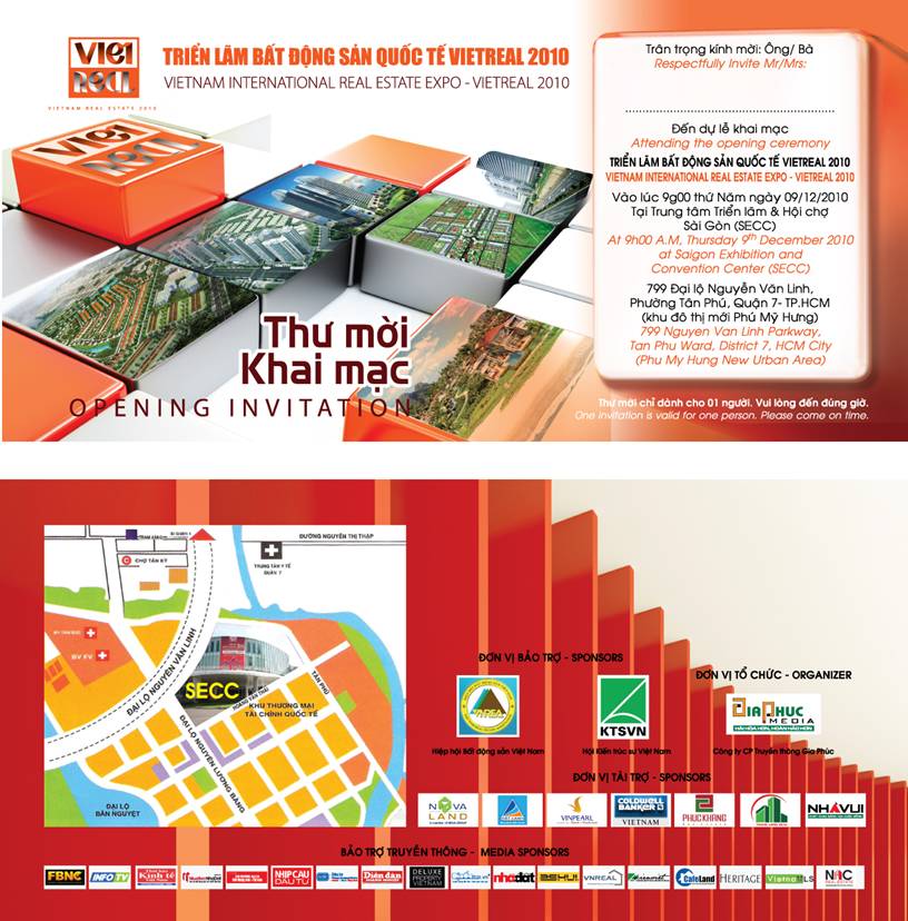 Được tổ chức bởi Công ty CP Truyền thông Gia Phúc dưới sự bảo trợ của Hiệp hội Bất động sản Việt Nam và Hội Kiến trúc sư Việt Nam, Triển lãm Bất động sản Quốc tế Vietreal 2010 diễn ra từ ngày 9-12/12 tại Trung tâm Hội chợ & Triển lãm Sài Gòn – SECC (799 Nguyễn Văn Linh, Phường Tân Phú, Quận 7, TP.HCM). Triển lãm sẽ góp phần đáng kể mở ra bức tranh toàn cảnh tươi sáng hơn cho thị trường bất động sản Việt Nam trong thời điểm hiện nay.