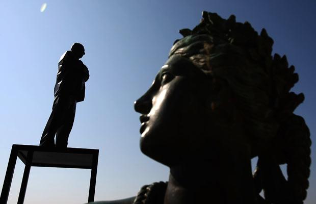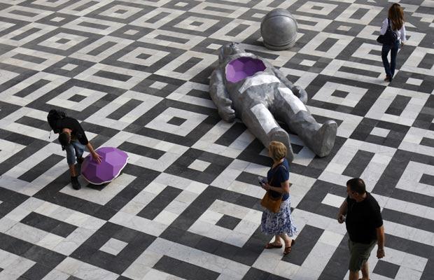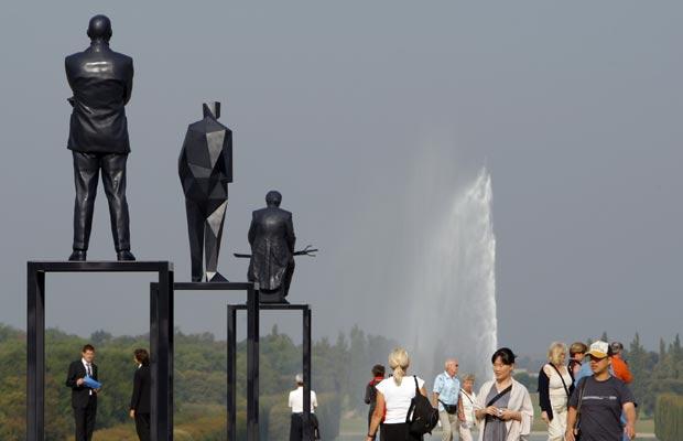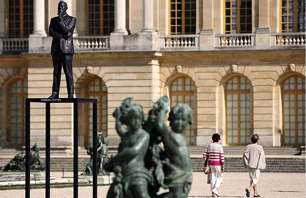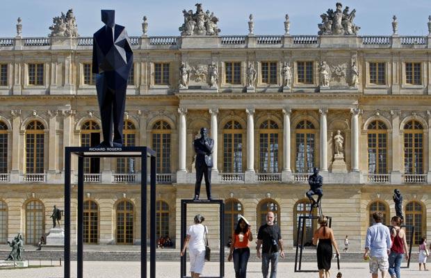 Một du khách đang ngắm nhìn bức tượng gọi là “The architects” của nghệ sỹ Xavier Veilhan, được trưng bày trong khu vườn hoàng gia tại cung điện Versailles(Pháp).