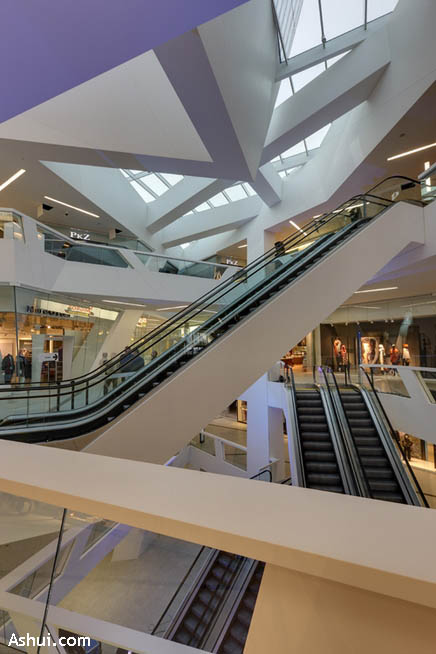 Những đường gấp khúc bất quy tắc của các bức tường cũng như hệ thống đèn lắp ngổn ngang như những họa tiết trang trí trong khu mua sắm tạo nên sự thích thú khám phá và chiêm ngưỡng cho khách hàng khi dạo bước mua sắm qua các cửa hàng
