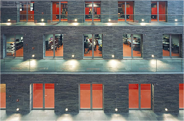 Nhìn tổng thể bên ngoài, tòa nhà mang hình dáng một chiếc hộp dán bảng quảng cáo khổng lồ, với hàng trăm mảnh ghép là những tấm kính trong sặc sỡ sắc màu, một thiết kế đồ họa phá vỡ sự đơn điệu của mô hình khối hộp đơn giản.