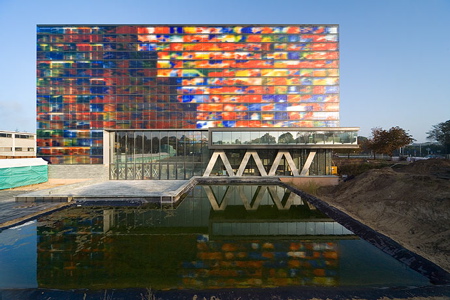 Mặt ngoài của trung tâm nghe nhìn Hilversum với hơn 2.000 ô kính màu