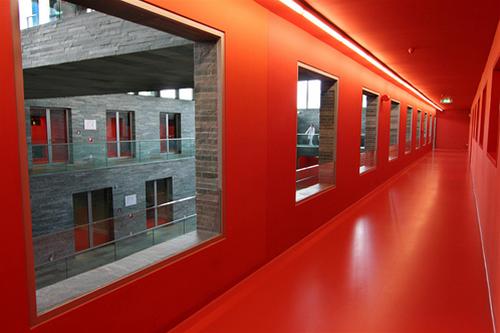Những tia nắng chuyển màu khi đi qua lớp kính đa sắc làm tăng thêm vẻ đẹp rực rỡ cho sảnh chính của tòa nhà. Công trình tận dụng chất liệu kính màu để khỏa lấp toàn bộ không gian còn khuyết bên trong. Một ngày mới bắt đầu với ánh mặt trời, tòa nhà cũng chìm ngập trong không gian bảy sắc cầu vồng rạng rỡ thay cho lớp tường gạch bê tông u ám vô cảm.
