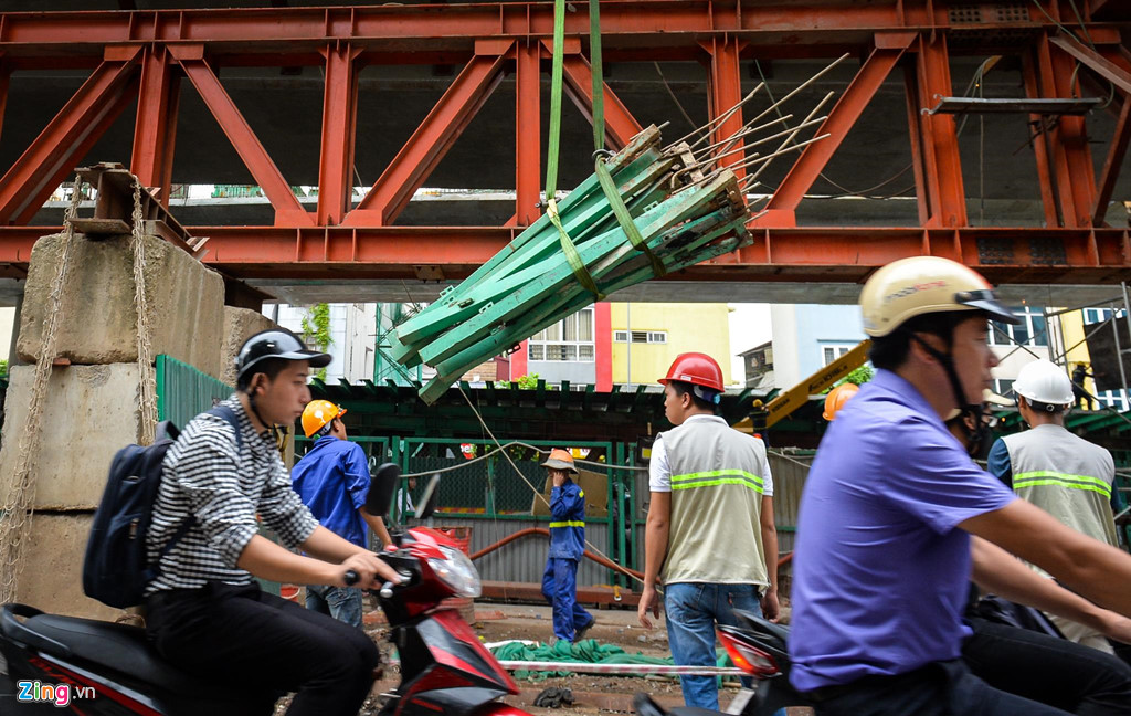 Hàng ngày, vật liệu xây dựng liên tục được cần cẩu vận chuyển lên ngay trên đầu người tham gia giao thông, tiềm ẩn nguy cơ tai nạn.
