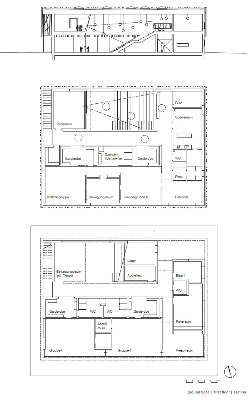 Sự tương xứng của phong cảnh diễn ra không chỉ trong bản thân không gian tòa nhà mà còn nằm ở cấu trúc nổi bật ngay từ bên trong. Tổ chức bên trong cho phép tận dụng tính logic trong khi sử dụng. Các nhóm nhà trẻ nằm dọc theo mặt phía nam có lối dẫn thẳng ra hiên và vườn, còn các nhóm khác được giữ an toàn ở tầng trên.