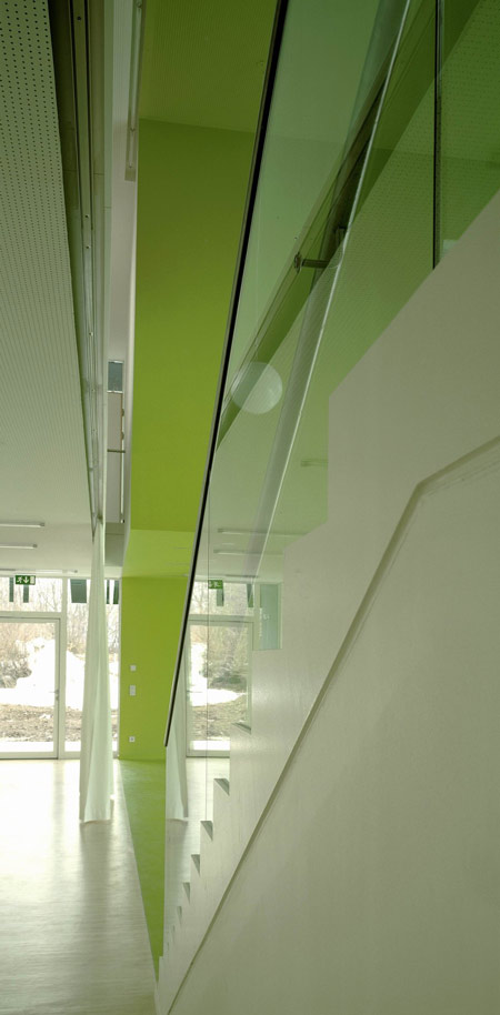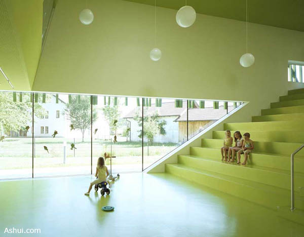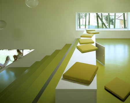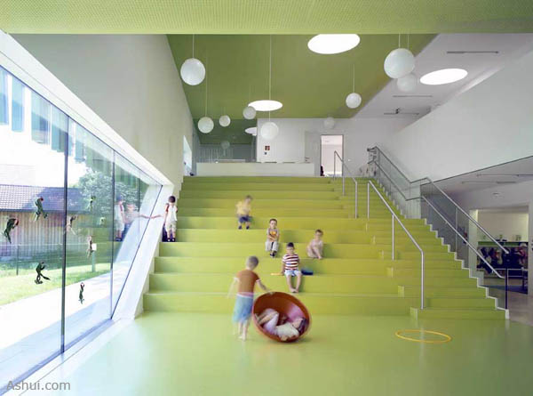 Trần nhà ốp kính ở tầng một như mời gọi thiên nhiên tràn vào trong nhà với các phòng trẻ được chiếu sáng bằng ánh sáng mặt trời. Những cánh cửa sổ mở ở tầng trên đằng sau mặt ngoài tạo nên một sự chiếu sáng hoàn toàn khác biệt và dành cho các bé học sinh mẫu giáo không khí của một môi trường giáo dục tốt.