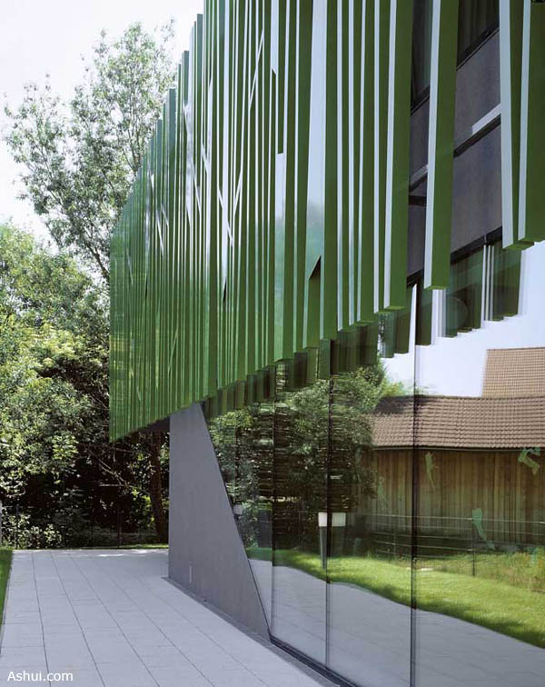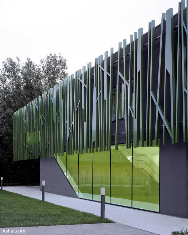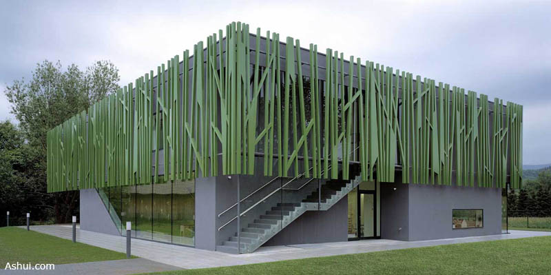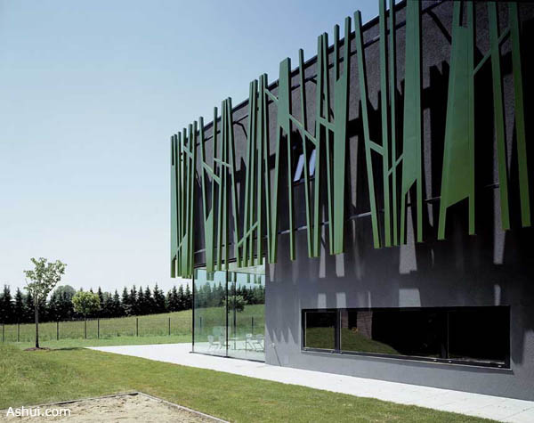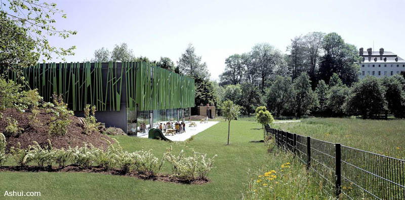 Những phiến lá cỏ khổng lồ nói lên tính thống nhất độc đáo của tòa nhà và tạo nên điểm đặc trưng định hướng cho nhà trẻ. Chúng không chỉ để trang trí mà còn đóng vai trò như một phần tiếp nối các chủ đề phong cảnh bằng cách tạo nên chủ đề cỏ cây để ngăn cách những khu vực riêng. Những hàng cây vân sam ngắt quãng có thể nhìn thấy ở rìa đồng cỏ hoặc những nhánh cây nhiều lá cạnh đó.