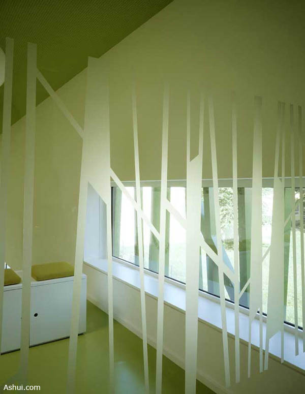 Thông thường, không gian của nhà trẻ sẽ dần dần tràn ngập những đồ sặc sỡ của trẻ con như đồ đạc, nguyên vật liệu và những công trình đầu tiên. Vì thế, người ta chủ động giảm bớt số lượng màu sắc, chỉ còn lại một tông màu đơn là màu cỏ xanh.