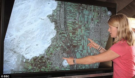 Ảnh bên: Tiến sĩ Parkak đang chỉ ra những nơi phát hiện các di chỉ cổ từ tấm bản đồ vệ tinh (Ảnh: BBC)