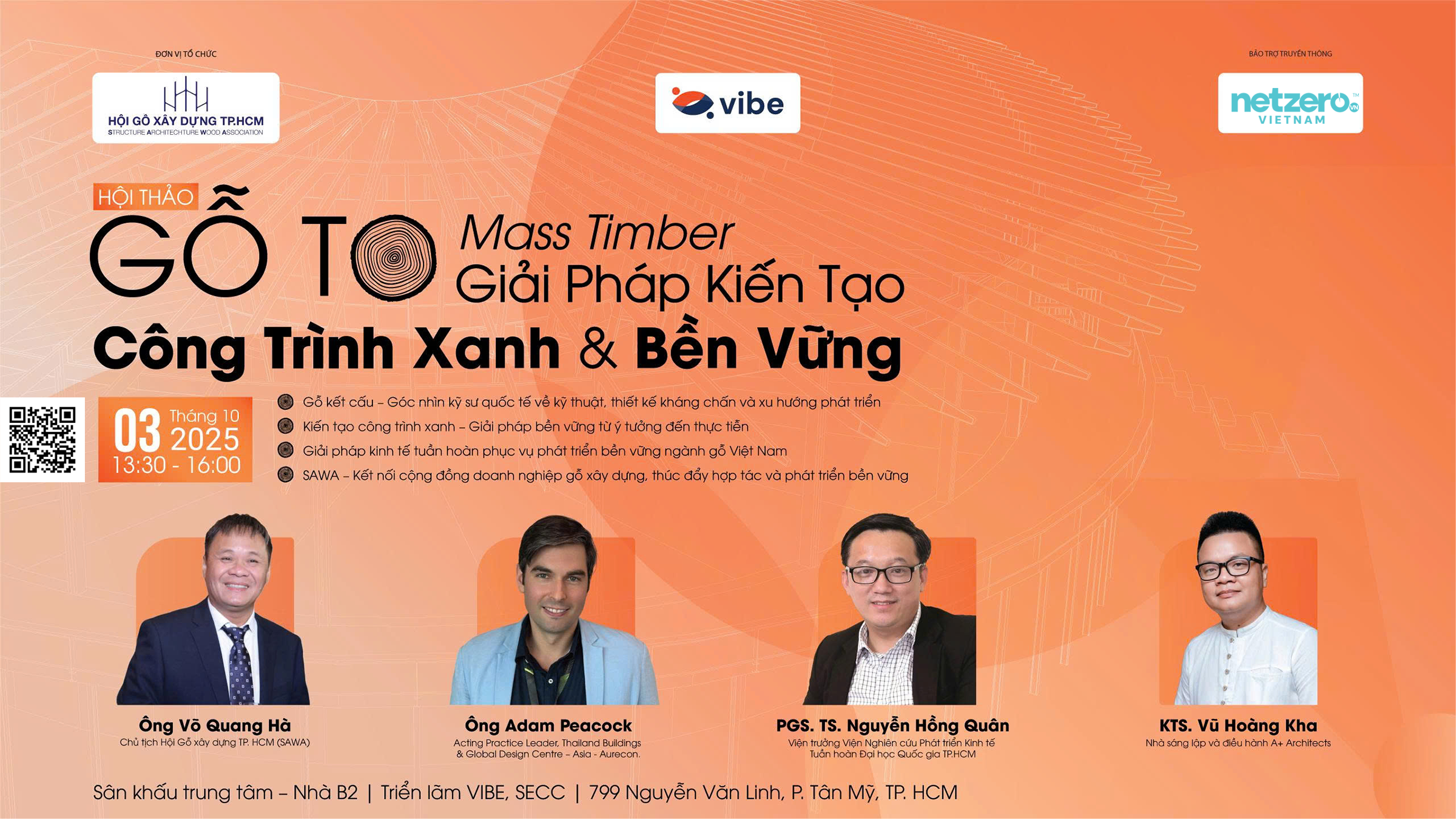 Hội thảo “Gỗ To – Giải pháp kiến tạo công trình xanh & bền vững” do Hội Gỗ Xây dựng TP.HCM (SAWA) chủ trì, với sự đồng hành truyền thông từ Net Zero Việt Nam, trong khuôn khổ Triển lãm Nội thất & Xây dựng Việt Nam – VIBE 2025, sẽ mang đến một diễn đàn quy tụ nhiều góc nhìn chuyên sâu về xu hướng vật liệu đang được xem là bước ngoặt lớn trong ngành xây dựng: Gỗ to (mass timber).