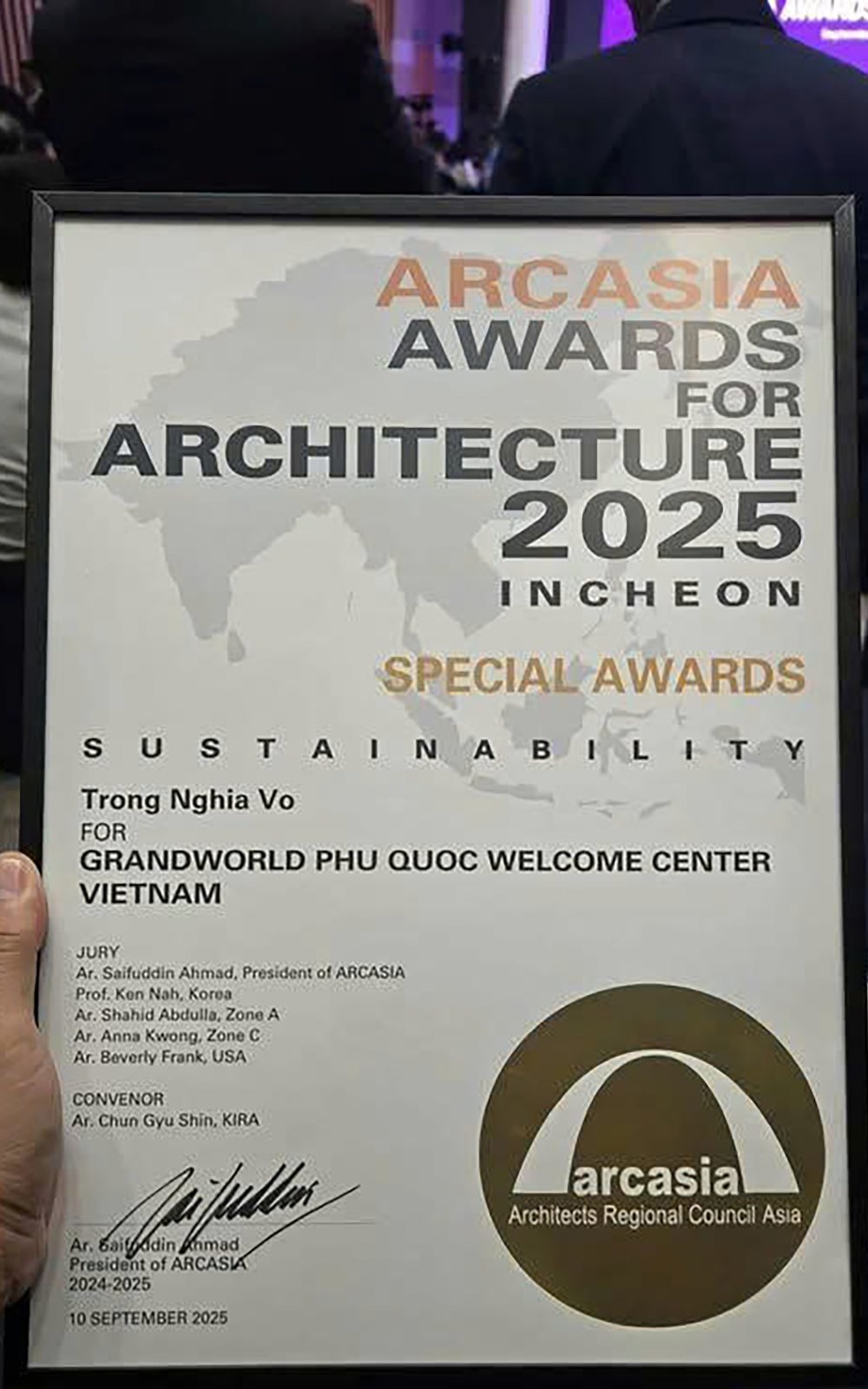 Công trình “Nhà đón Grand World Phú Quốc” của Công ty Kiến trúc Võ Trọng Nghĩa (VTN Architects) vừa xuất sắc đoạt Giải Đặc biệt (Special Award) ở hạng mục Công trình bền vững (Sustainability) tại Giải thưởng Kiến trúc Châu Á ARCASIA 2025.