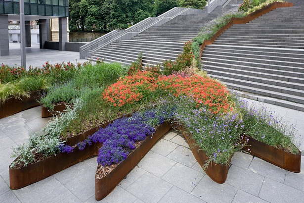 Khu vườn lượn sóng nhấp nhô leo dần các bậc cầu thang theo những cấu trúc và màu sắc khác nhau. Như một không gian đô thị năng động, khu vườn dịch chuyển theo thời gian và theo mùa. Nó nhìn giống một thác nước đang chảy xuống với những sắc màu như đang hòa quyện hoặc tan chảy vào nhau, như đang kể một câu chuyện về sự mở rộng cảnh quan ra ngoài phạm vi Không gian công cộng và Kiến trúc, bằng cách đó thay đổi hình dung và cảm nhận của người sử dụng.