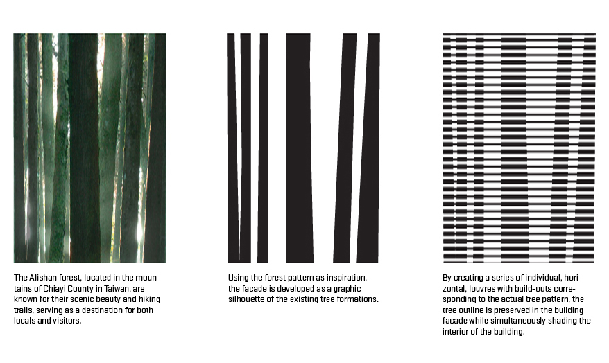 Bóng cây bao phủ xung quanh được lấy cảm hứng từ những cánh rừng cây bách của Vườn Quốc gia Alishan, một viên ngọc quý của quốc gia và là điểm đến phổ biến ở miền núi Chiayi County của Đài Loan.