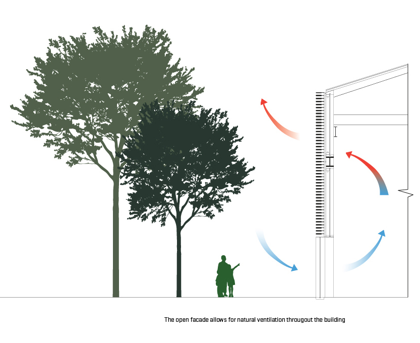 HAO đã tạo ra mặt tiền rừng từ việc thiết kế một loạt các cửa chớp gỗ khi xếp chồng lên nhau theo chiều ngang, tạo ra những phác thảo về cây. Mặt tiền bằng gỗ rừng như giúp buộc cấu trúc với cảnh quan xung quanh và cung cấp bóng mát cho nội thất.