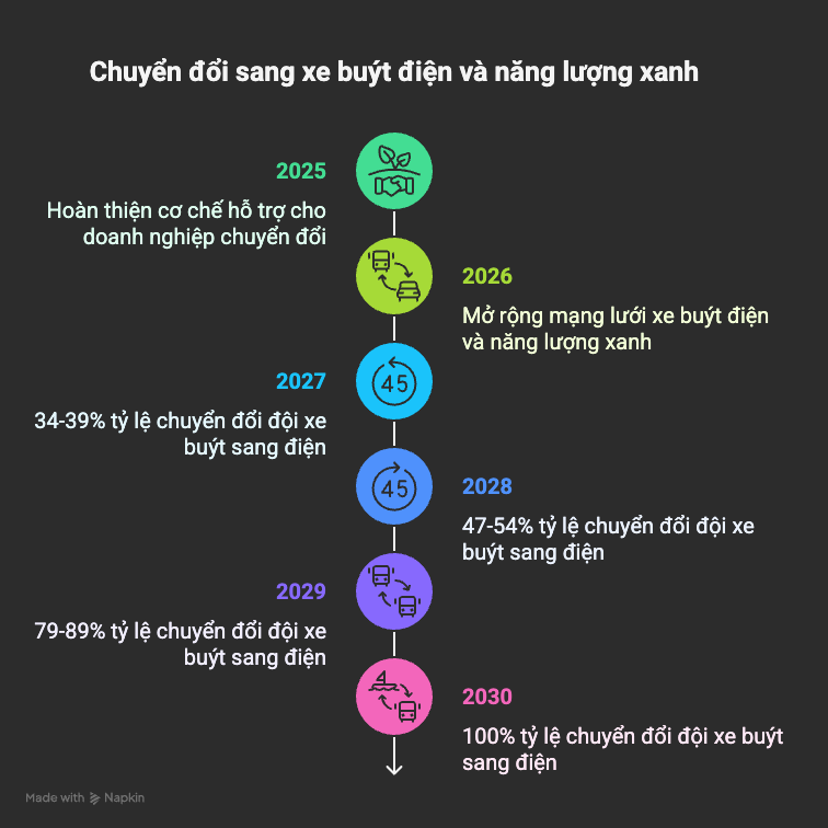 Giai đoạn 2027-2030, chuyển đổi theo lộ trình, 100% xe buýt sử dụng xăng, dầu diezel chuyển sang sử dụng điện, năng lượng xanh chậm nhất vào năm 2030. Tỷ lệ chuyển đổi phương tiện xe buýt điện, năng lượng xanh (dự kiến) năm 2027 là 34-39%; năm 2028 là 47-54%; năm 2029 là 79-89%; năm 2030 là 100%.