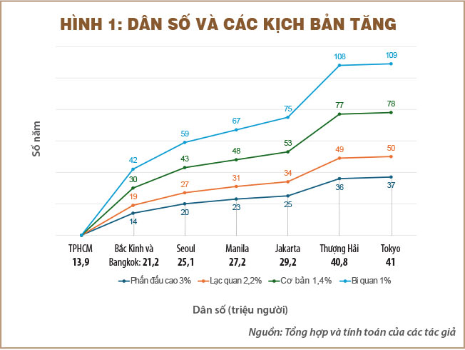Với kịch bản cơ bản, sau khoảng ba thập niên nữa dân số TPHCM mới bằng Bắc Kinh hay Bangkok hiện nay, hơn bốn thập niên để có mức của Seoul, trên dưới năm thập niên để có mức của Manila và Jakarta và sang đầu thế kỷ 22 mới có thể bằng vùng Tokyo hay Thượng Hải.