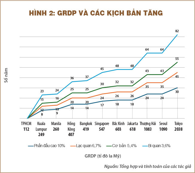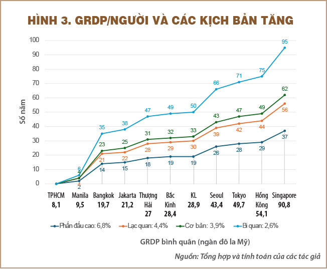 Các con số của kịch bản cơ bản là sẽ cần hai thập niên để có mức 20.000 đô la Mỹ, ba thập niên để có mức 30.000 đô la Mỹ và bốn thập niên để có mức trên 40.000 đô la Mỹ; kịch bản lạc quan sẽ nhanh hơn một chút; với kịch bản bi quan thì TPHCM không có cơ hội để đuổi kịp các đô thị đi trước khác về GRDP/người.