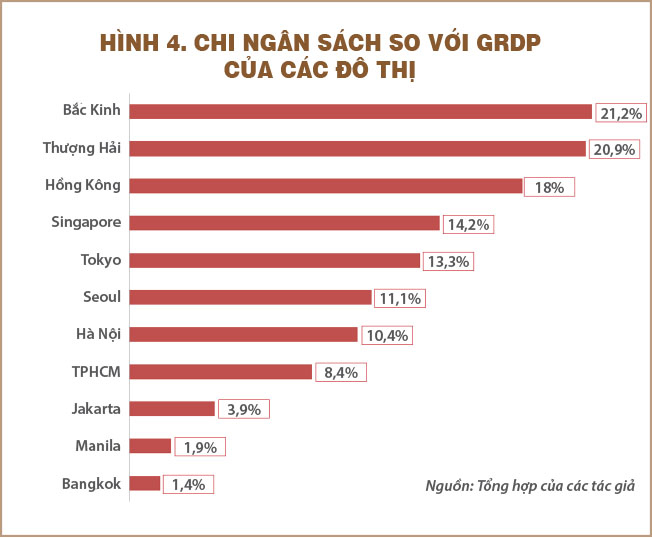 Chính quyền giữ vai trò có thể nói là quan trọng nhất trong việc dẫn dắt sự phát triển của một thành phố. Trong đó, ngân sách có ý nghĩa hết sức quan trọng vì nó thể hiện tính chủ động và khả năng của chính quyền. Dự toán chi ngân sách vào năm 2024 của TPHCM (tổng của ba địa phương) là 237.000 tỉ đồng, bằng 8,4% GRDP. Con số này cao hơn Jakarta, Manila và Bangkok, nhưng chỉ bằng khoảng 80% của Hà Nội và thấp hơn hẳn so với các đô thị đi trước (hình 4). Đây là một vấn đề rất lớn của TPHCM. Nói cách khác, đây là một nan đề cần phải giải.