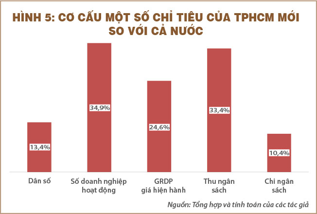 13,4% dân số của cả nước nằm ở TPHCM, với 34,9% số doanh nghiệp đã tạo ra khoảng một phần tư GDP và một phần ba số thu ngân sách của cả nước, nhưng TPHCM chỉ chiếm 10,4% mức chi ngân sách của cả nước. Mức chi ngân sách so với GRDP hợp lý với TPHCM trong hai thập niên tới cần nâng lên gấp đôi con số hiện tại hay ở mức của Tokyo và Singapore. Trước mắt, mức chi ngân sách của thành phố nên bằng mặt bằng chung của cả nước hay chi ngân sách so với GRDP của TPHCM cần được nâng ngay lên mức khoảng 10% GRDP, tương đương với Hà Nội hiện nay.