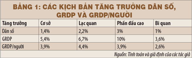 Căn cứ vào những số liệu nêu trên và dự báo tình hình trong thời gian tới, bài phân tích đưa ra bốn kịch bản về tăng trưởng dân số, GRDP và GRDP/người cho TPHCM như ở bảng 1 (các kịch bản này là để hình dung vị trí và khả năng phát triển của TPHCM chứ không phải là các kịch bản dự báo).