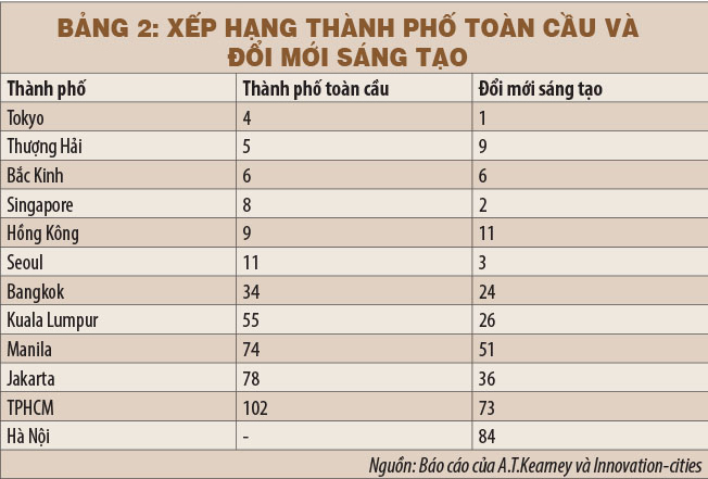 Xếp hạng các thành phố toàn cầu của Hãng tư vấn A.T. Kearney và xếp hạng năng lực đổi mới sáng tạo của Innovation-cities được trình bày trong bảng 2.