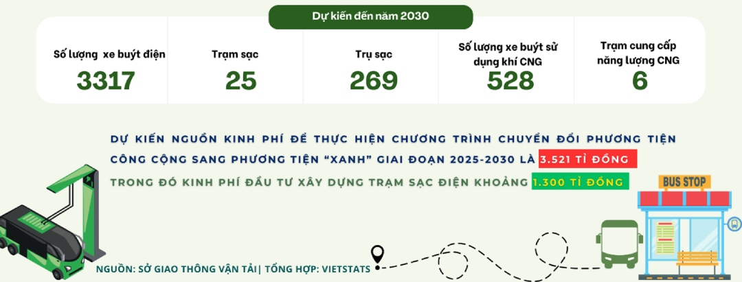 Theo kế hoạch của Sở Xây dựng, thành phố đặt mục tiêu đến năm 2030 sẽ hoàn tất việc chuyển đổi toàn bộ đội xe buýt sang sử dụng năng lượng xanh. Cụ thể, 2.771 xe buýt sử dụng diesel hiện nay sẽ được thay thế, trong đó có 1.663 xe thuộc các tuyến hiện hữu và 1.108 xe là phương tiện đầu tư mới cho các tuyến mở rộng.
