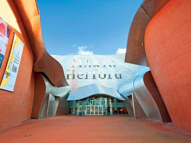 | Bảo tàng MARTA HERFORD – Thiết kế: Gehry Partners LLP, Los Angeles – Thời gian xây dựng: 2001 – 2005 – Diện tích khu đất: 7.993m² – Diện tích xây dựng: 3.444m² – Tổng diện tích mặt bằng: 7.200m² – Kết cấu: Tường bêtông cốt thép chịu lực (500m³), lớp bọc mặt tiền bằng gạch nung, Mái kết cấu thép (400 tấn), tấm lợp thép không gỉ (5.000m²). – Vật liệu hoàn thiện: Tường gạch nung: 3.120m² (180.000 viên), Thạch cao: 6.050m². |
