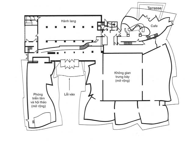 Đặc điểm của hệ mái này đặc biệt rõ nét ở lối vào, nó bao trùm và bọc lấy khối nhà Lippoldbau, liên kết khối mở rộng và khối nhà cũ. Thủ pháp kiến trúc sử dụng một hành lang lấy sáng phía trước khối nhà Lippoldbau giúp cân bằng tương quan ánh sáng giữa phía trong sảnh đón và lối vào phía bên ngoài. Mặt bằng công trình được chia thành bốn phân khu rõ rệt: khu nhà Lippoldbau với quầy lễ tân, shop lưu niệm, không gian phụ; phòng hội thảo; khu vực không gian trưng bày với năm phòng trưng bày và một nhà hàng.