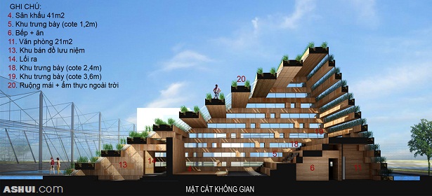 – Công trình như được sinh ra từ mặt đất, độ dốc của khối tích giúp tạo điểm nhìn tốt từ các hướng tiếp cận.
